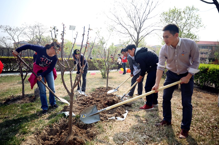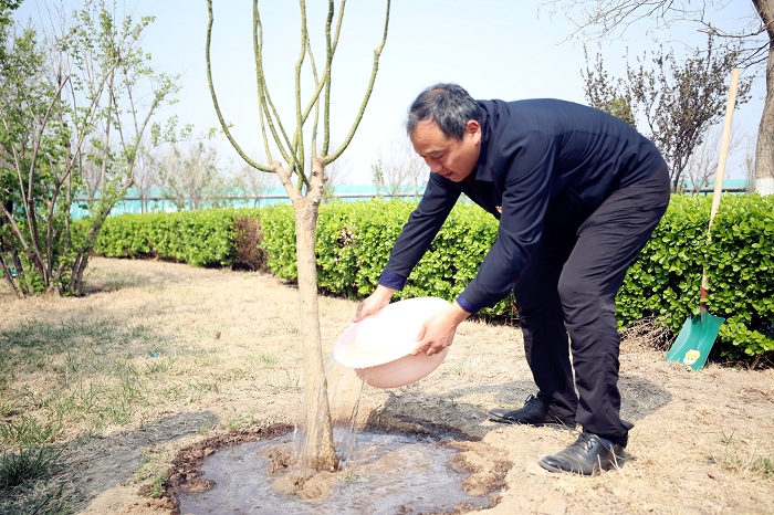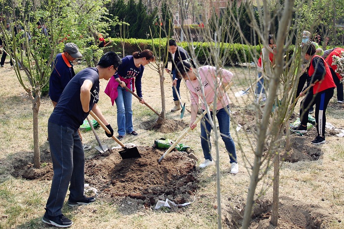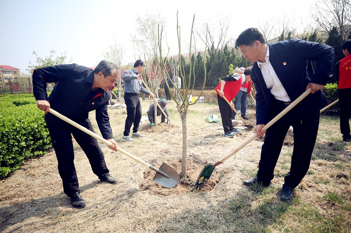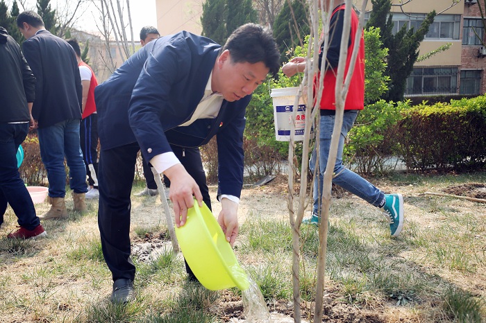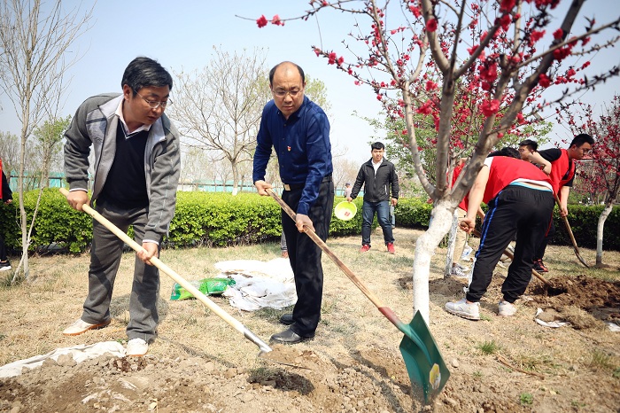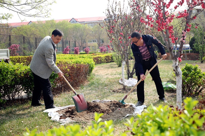 植树现场一片欢声笑语、热火朝天。北美海棠、碧桃、金叶槐……师生们接连种下10棵、20棵……参加植树的党政领导同师生们一起扶苗培土、拎桶浇水,不时同身边的师生交流爱护自然、保护环境、共建和谐美丽校园的美好憧憬。