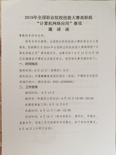 6月13日至16日,全国职业院校技能大赛(业内人士多称之为“职业教育国赛”)高职组“计算机网络应用”赛项的比赛在福建信息职业技术学院举行。天津石油职业技术学院电子信息系计算机网络技术专业教研室主任李洋洋应邀担任该赛项裁判员,并圆满完成了执裁任务。