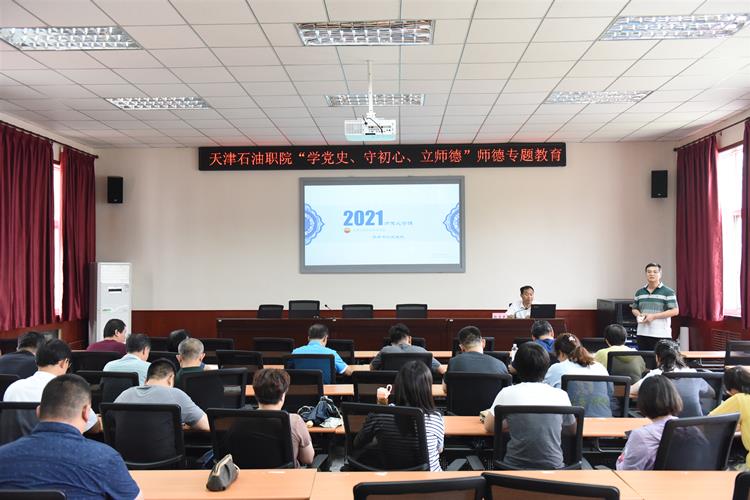 为贯彻落实《教育部关于在教育系统开展师德专题教育的通知》要求,紧密结合党史学习教育开展师德师风建设,教育引导广大教师坚定理想信念、厚植爱国情怀、涵养高尚师德,6月23日,天津石油职业技术学院组织开展了“学党史、守初心、立师德”师德专题教育活动,学院党委书记赵爱民、院长韩福勇亲临教育教学一线讲授师德必修课。
