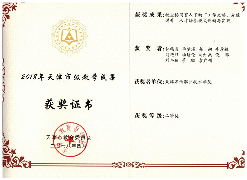 学院课题《校企协同育人下的“工学交替、分段递升”人才培养模式创新与实践》荣获天津市教学成果二等奖